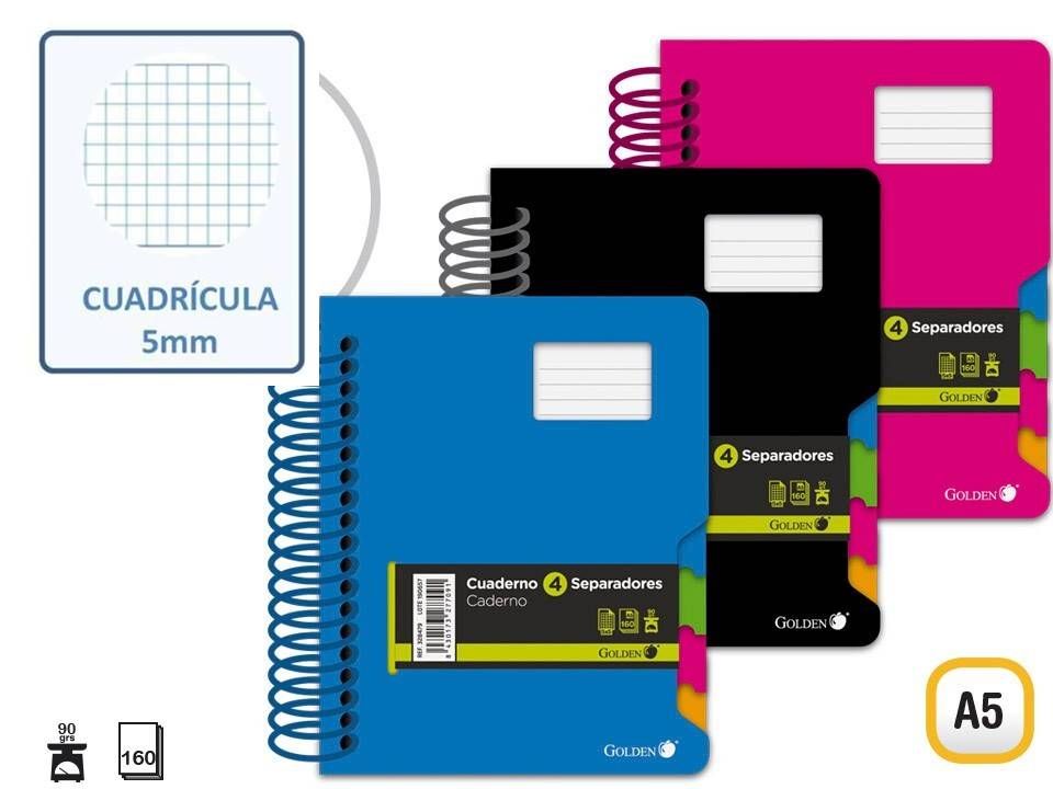 GOLDEN CUADERNO ESPIRAL A5 PP 160 HOJAS CUADRICULA 5X5 CON SEPARADORES
