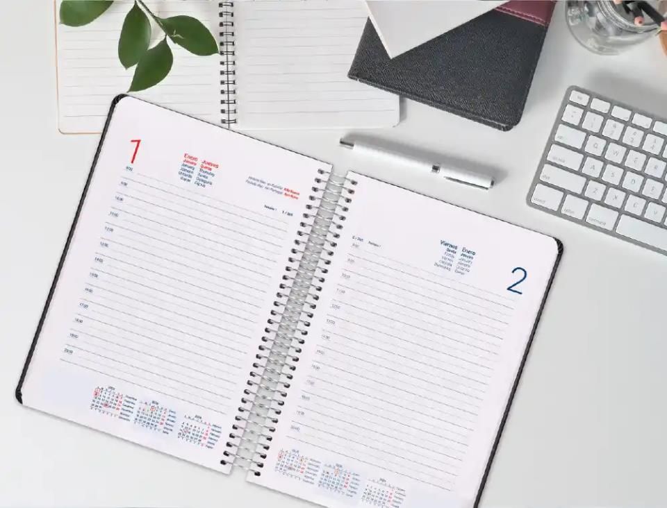 Agenda espiral olbia A5 (150 x 210 mm) día página tapa polipropileno metalizado papel 60 gr.Incorpora calendario trienio, santoral, distancias kilométricas entre ciudades europeas, españolas y portuguesas, hojas de notas, listín telefónico, interior en castellano y portugués.