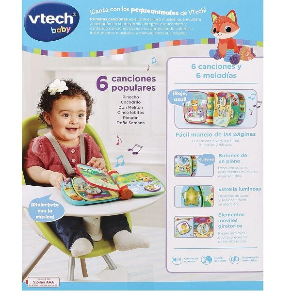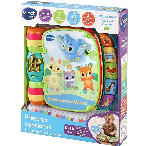 Enciende las Primeras Canciones Libro Interactivo Para Bebés VTech 166777 para que los pequeños de tu hogar se mantengan entretenidos y diverditos mientras aprenden.Encontramos en él un fácil manejo donde descubriremos divertidas rimas junto a dibujos, disfrutaran con canciones populares y mas de 50 melodías, sonidos y frases. Gracias a las 7 páginas interactivas tendrán la posibilidad de mejorar aspectos educativos y facilitar el desarrollo motor, sensorial y del lenguaje.Edad recomendada: + de 6 meses.Incluye: Una caja de almacenaje ilustrada y un libro interactico para bebés mis primeras canciones en color azul.